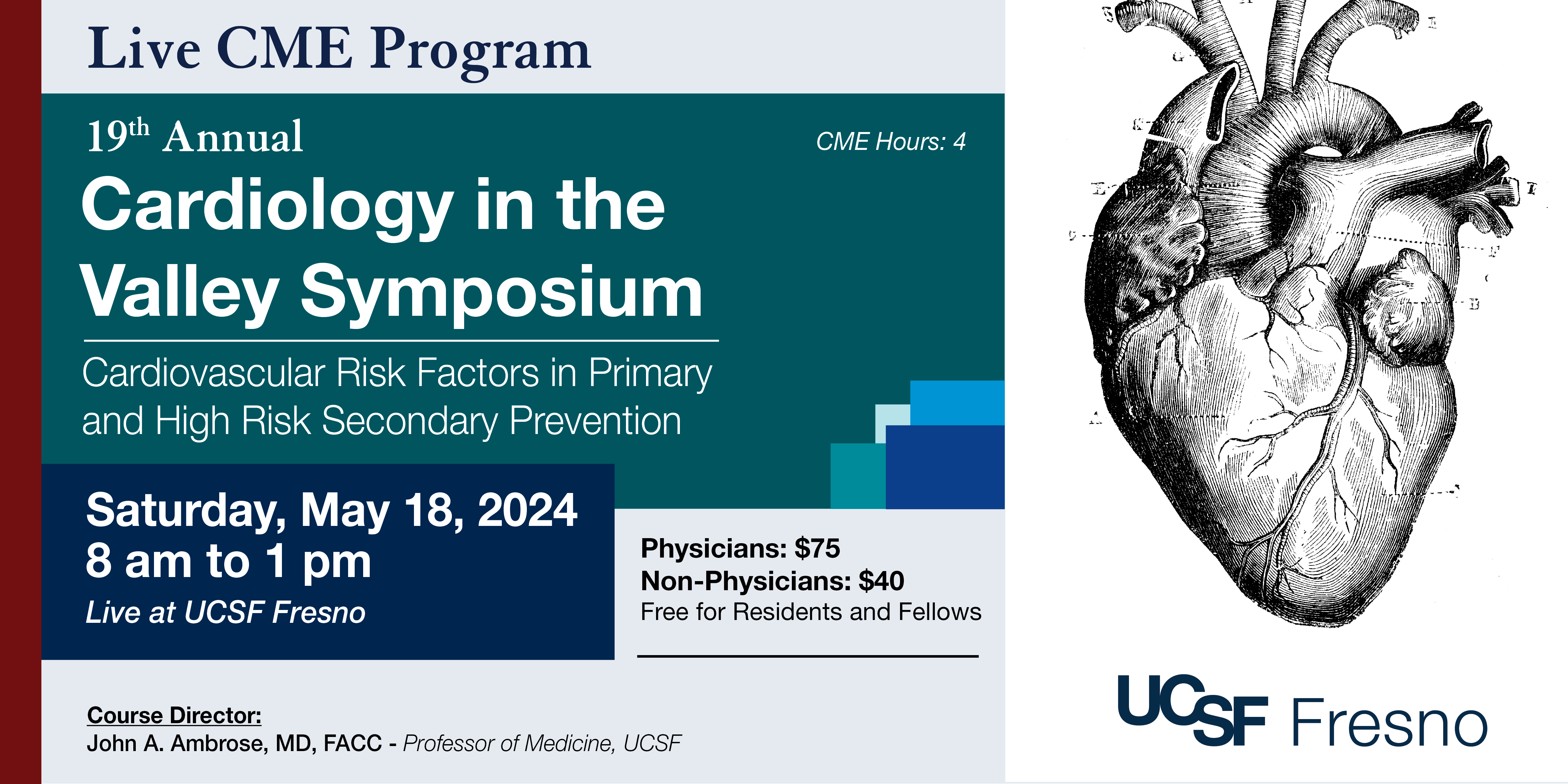 Join the UCSF Fresno Division of Cardiology, live at UCSF Fresno or via Zoom webinar, for the 19th installment of Cardiology in the Valley. The 2024 symposium will provide attendees with the most up-to-date information on cardiovascular management to reduce morbidity and mortality in patients in the San Joaquin Valley. Topics will include High Blood Pressure, Cigarette Smoking and Vaping, Diabetes Pathophysiology and Management, and Case Studies with an Emphasis on Lipid Management. Attend in-person or via Zoom webinar.