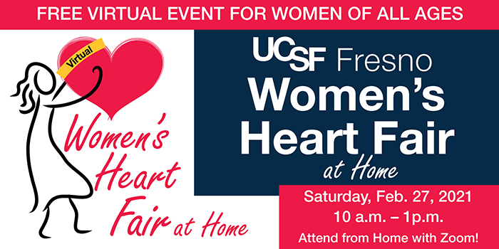 Heart disease is the leading cause of death for women in the United States. To increase awareness and improve heart health among women of all ages, UCSF Fresno will host a virtual version of the annual Women’s Heart Fair via Zoom webinar. Hear from local experts, participate in a yoga class for all levels, watch a live cooking competition, and enter to win prizes.