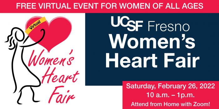 Date:February 26, 2022 2022 Women’s Heart Fair at Home Enjoy free heart health lectures, wellness tips, and an introduction to meditation at the UCSF Fresno Women’s Heart Fair. Saturday, Feb. 26, 2022 10 a.m. to 1 p.m. Attend at Home with Zoom! https://www.eventbrite.com/e/2022-ucsf-fresno-virtual-womens-heart-fair-tickets…