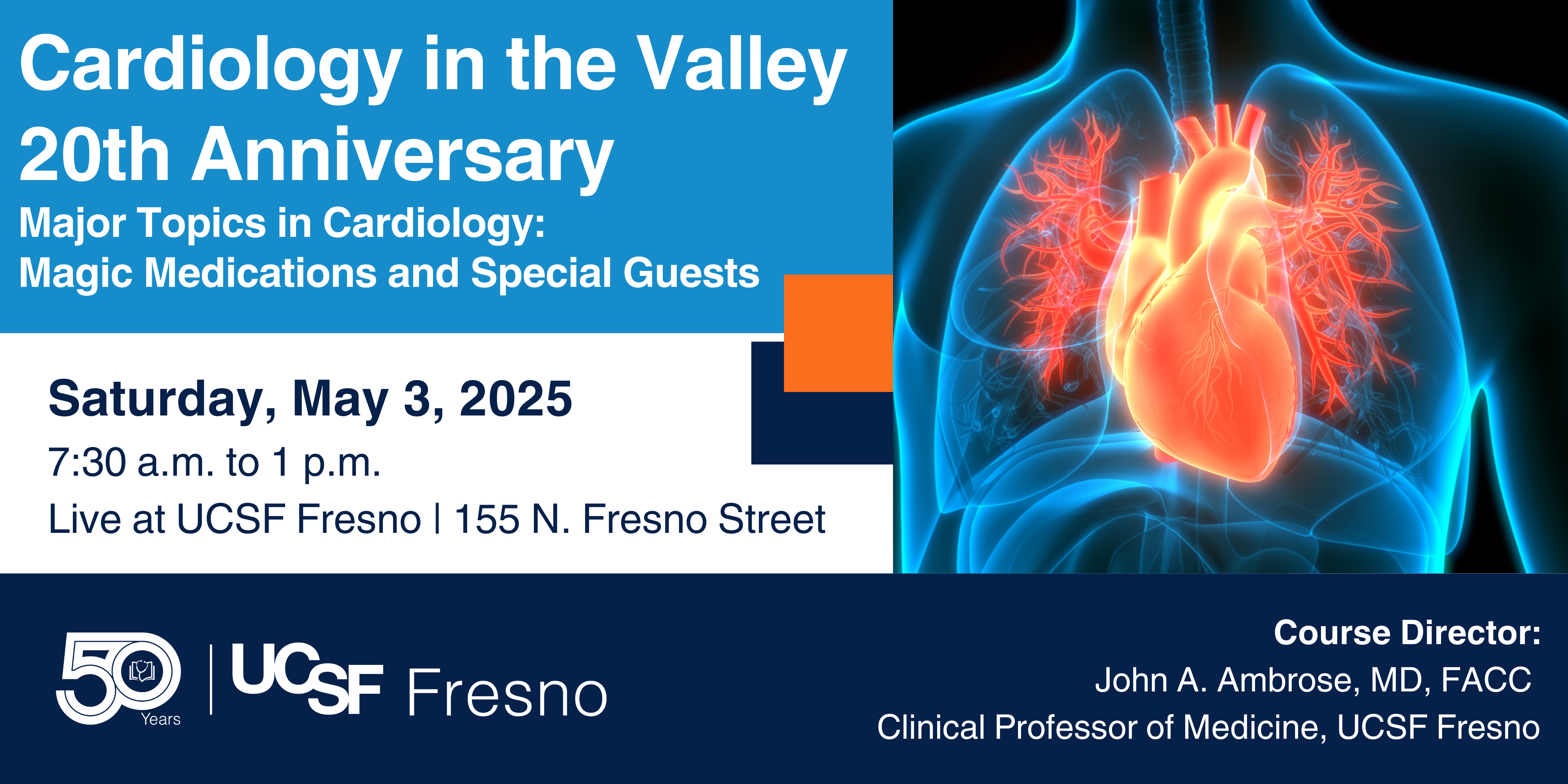 Register now for the 20th anniversary of the Cardiology in the Valley Symposium series hosted by program director John A. Ambrose and the UCSF Fresno Division of Cardiology. The 20th year of the symposium will feature two highly-renowned special guests and will provide attendees with the most up-to-date information on Transcatheter Aortic Valve Replacement, Dual Antiplatelet Therapy After Percutaneous Coronary Intervention, 'Magic Medications' and more.