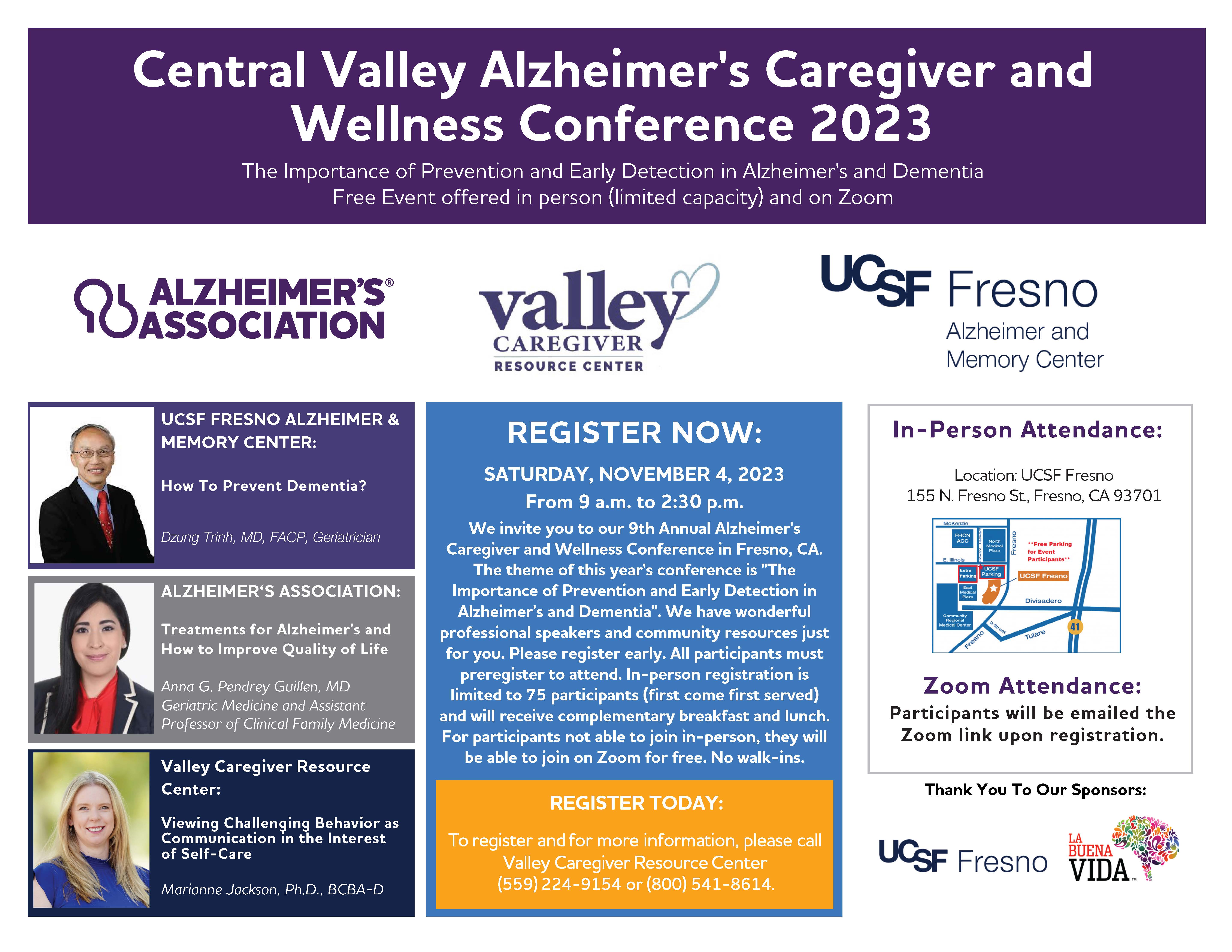 We invite you to our 9th Annual Alzheimer's Caregiver and Wellness Conference in Fresno, CA. The theme of this year's conference is "The Importance of Prevention and Early Detection in Alzheimer's and Dementia". We have wonderful professional speakers and community resources just for you.
