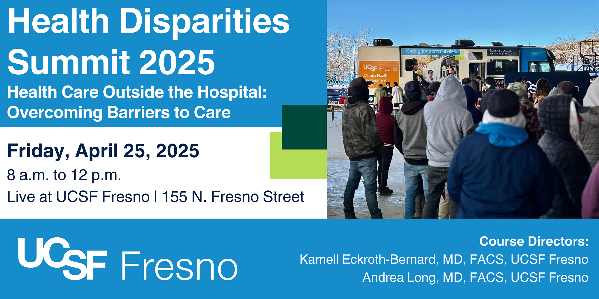 Join the Intentional Recruitment Coalition (IRC) in collaboration with the UCSF Fresno Department of Surgery, the largest surgical training program in the San Joaquin Valley for the 2025 Health Disparities Summit. This annual symposium is dedicated to enhancing and expanding access to health care for disadvantaged populations affected by language barriers, socioeconomic disparities, cultural differences, and more.