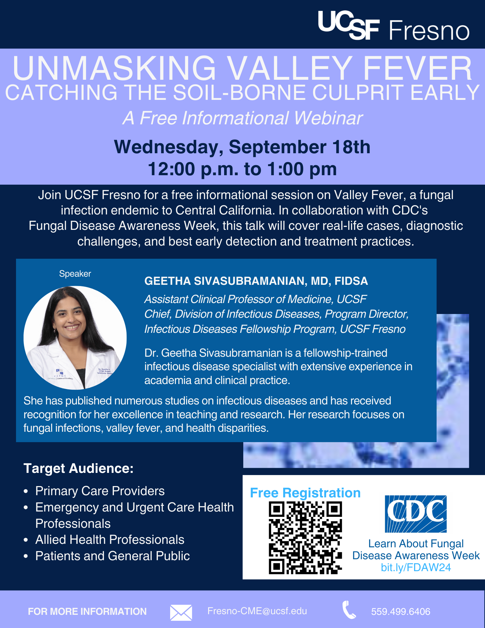Join UCSF Fresno for a free informational session on Valley Fever, a fungal infection endemic to Central California. In collaboration with CDC’s Fingal Disease Awareness Week, this talk will cover real-live cases, diagnostic challenges, and best early detection and treatment practices.