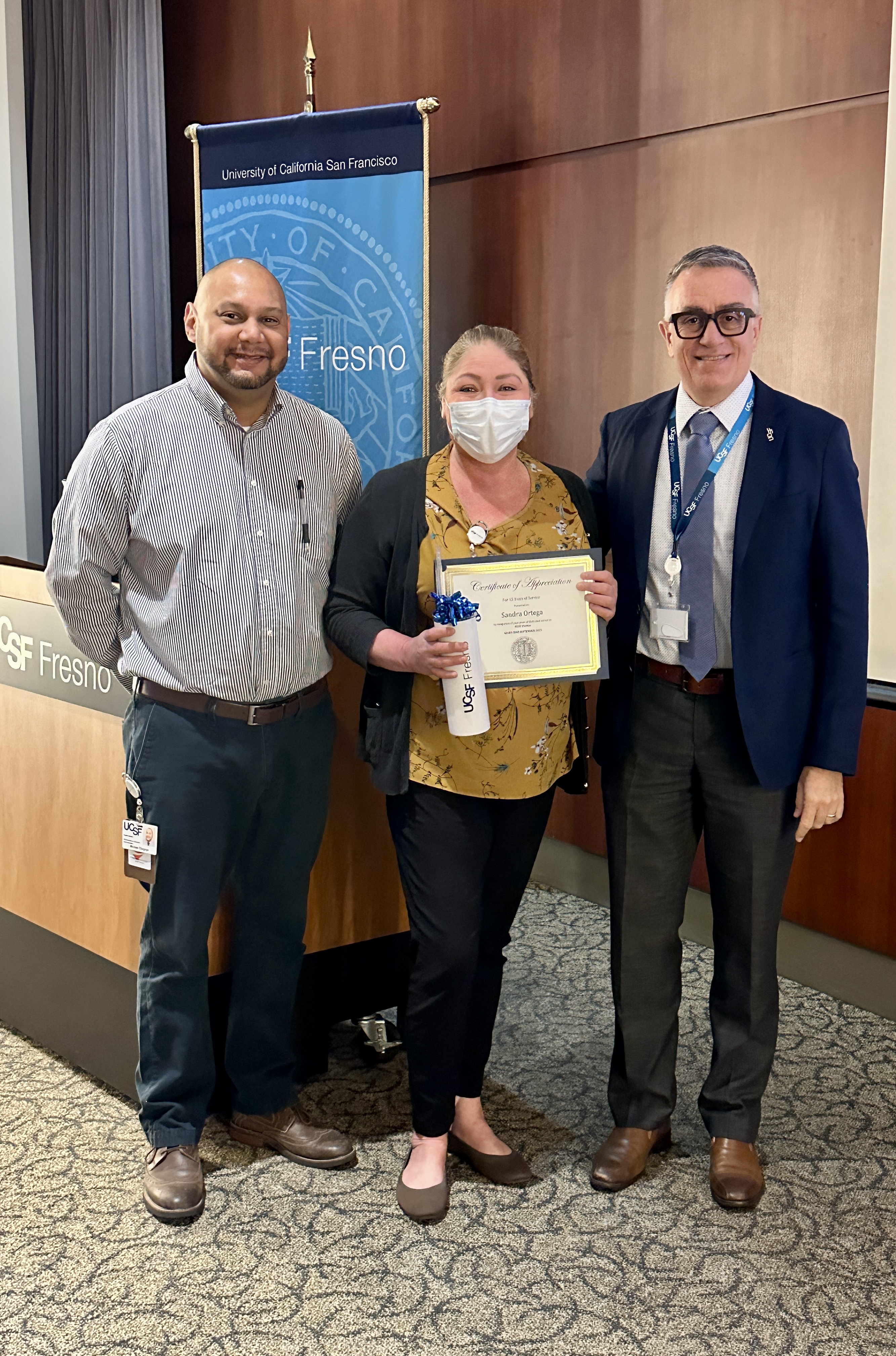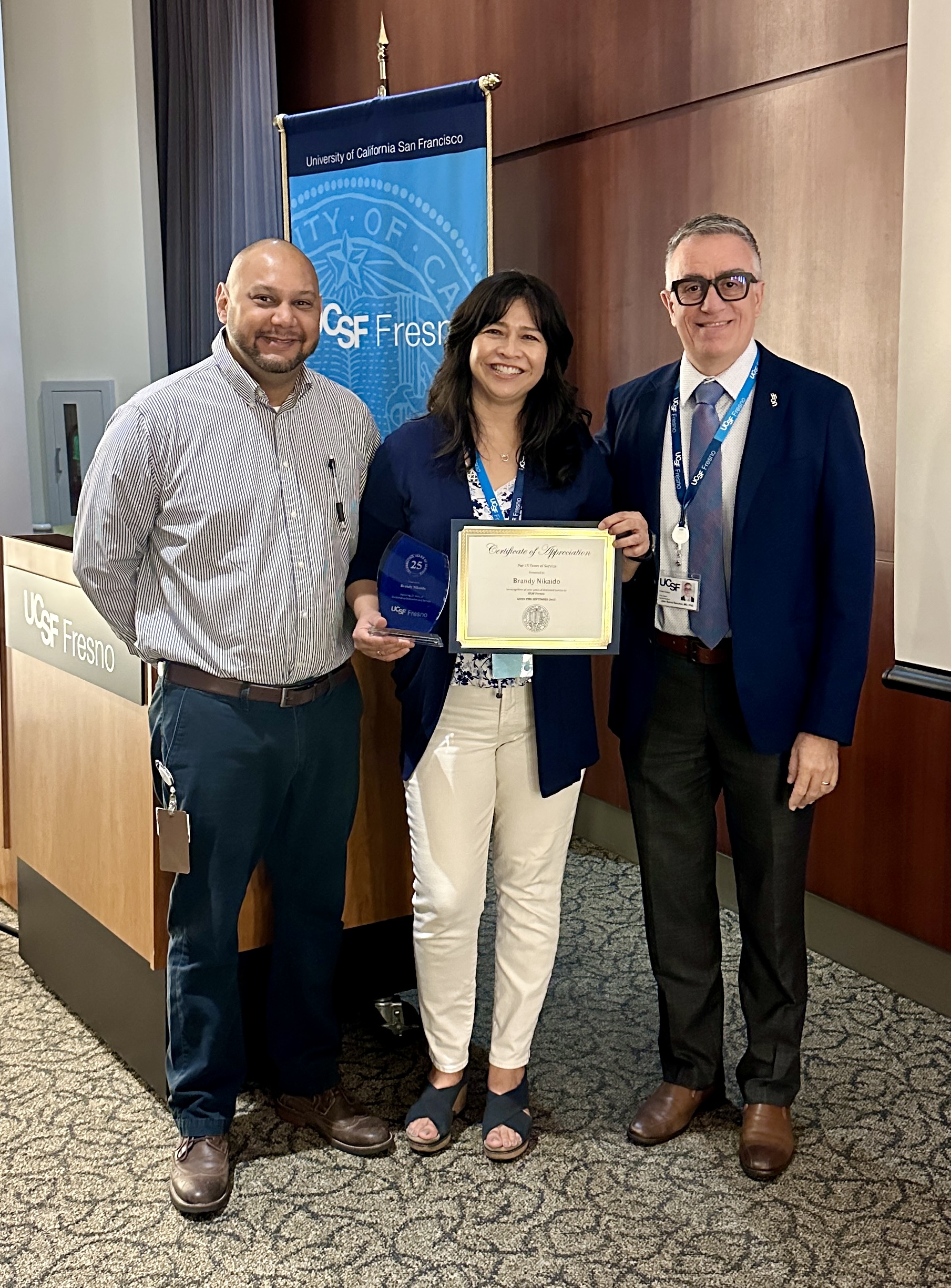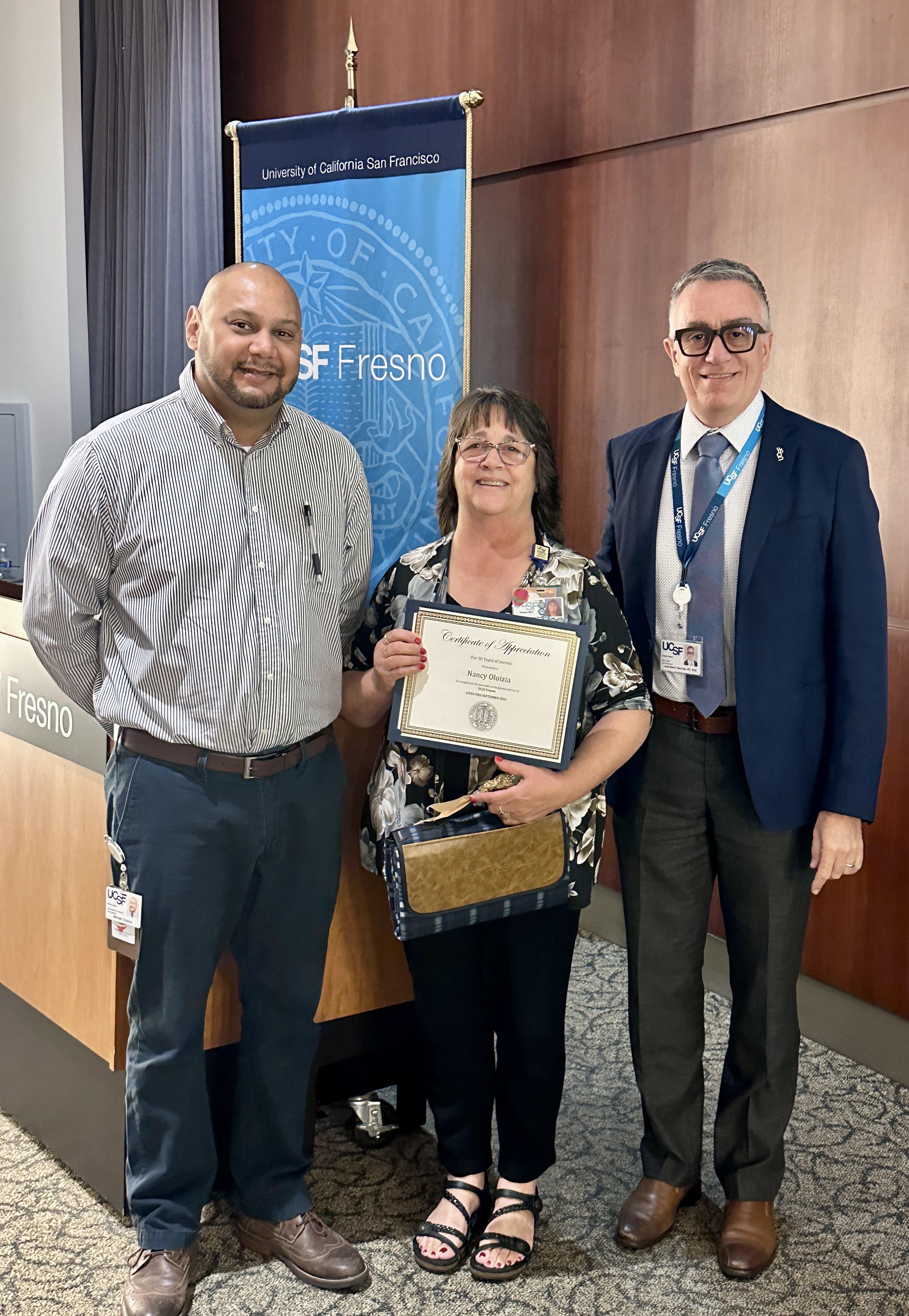 Congratulations to the UCSF Fresno staff members who were honored with Milestone Service Awards. UCSF Fresno proudly recognizes those who have reached a service milestone of five, 10, 15, 20, 25, 30, 35, 40, 45 or 50 years. Staff were recognized at an All-Staff Meeting and posed for photos with Vice Dean Jose M. Barral Sanchez, MD, PhD, (right) and Michael A. Chagoya, Human Resources administrative assistant III, (left).
