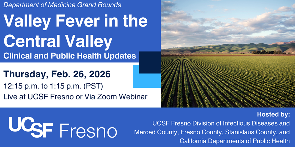 Learn about the recent expansion of Coccidioidomycosis in the Central Valley and what providers need to know. Join the UCSF Fresno Division of Infectious Diseases, Merced County, Fresno County, Stanislaus County, and California Departments of Public Health for this informative session. Includes 1 CME Credit.